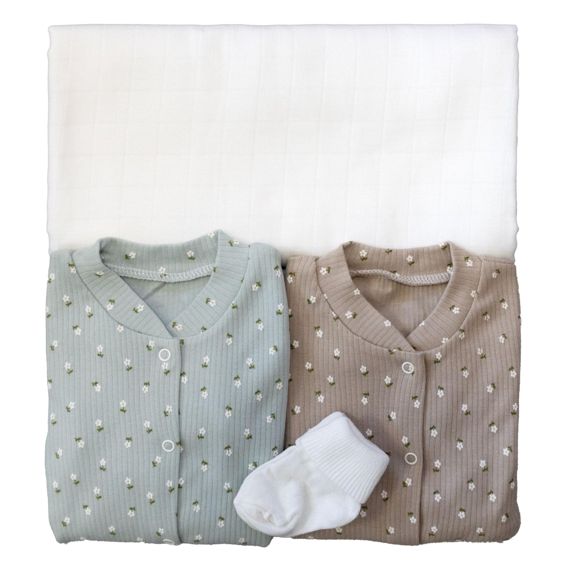 Kjo kuti përmban dy palë shpihoze për bebe të përshtatshme për gjitha stinët. Po ashtu edhe një muslin swaddle që është produkt shumë funksional. Të gjitha jan 100% pambuk organik.